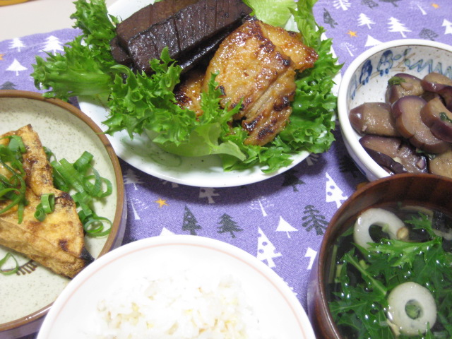 副菜はこれも今年最初の茄子のビネガーソテー。それと厚揚げの揚げ豆腐風。