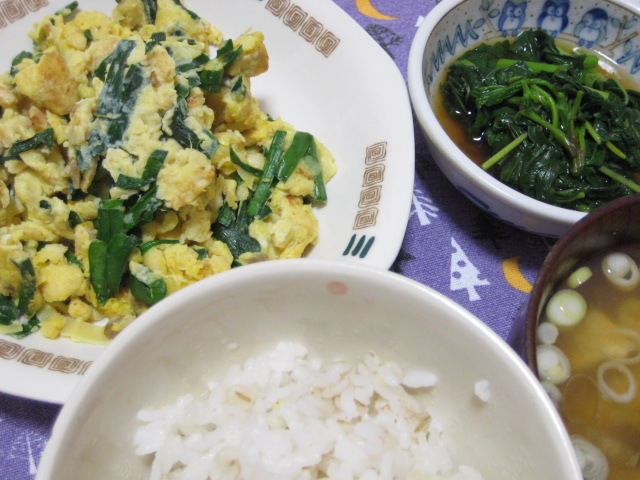 で、ご飯の方にたっぷりと鮭が入っているので、おかずは肉抜きでよかろうということで、厚揚げとニラの炒め物を。味噌汁は蕪とモロヘイヤで。