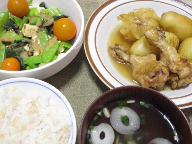 副菜は干し豆腐と茹で野菜のサラダ。汁物は市販のお吸い物で。