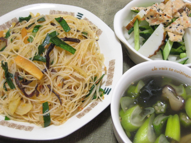 サラダは大根とキュウリとかまぼこに、ベトナムのゴマせんべいのトッピング、ドレッシングはヌクチャムで。スープは干しキノコとワカメと塩鶏でした。