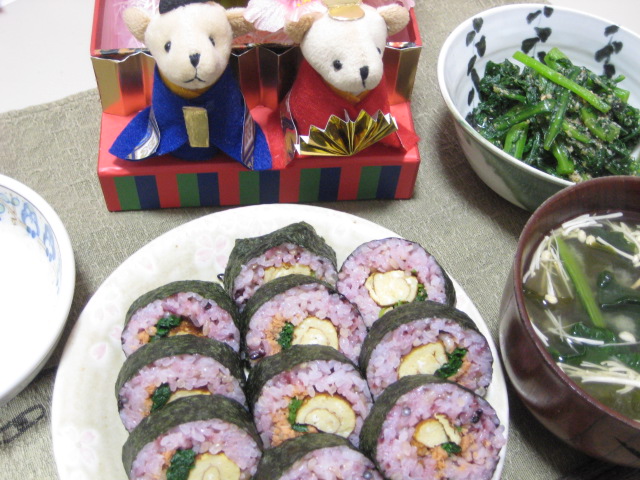 巻き寿司って、思えば随分と長い間作ってませんでしたwたまにはやらないと、巻き方を忘れてしまいますね(今回はどうにか誤魔化せた?)wwご飯に色がついてるのは黒米が混ぜてあるからです。これが赤米なら春らしいピンク色になったんですが、黒米なので藤色になったのはご愛嬌で(苦笑)今は粉末のすし飯も湿気防止用のチャックがついてるのがあるので、便利ですね。マヨネーズは寿司の中には巻き込まずにつけて食べられるよう、わさびマヨソースを添えてみました。