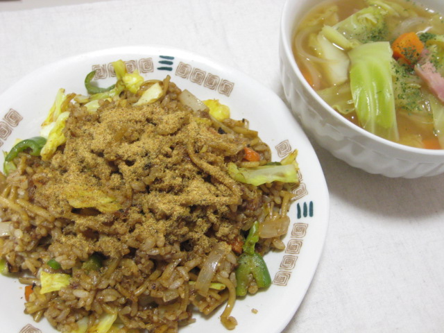 で、スープも野菜コンソメということで、具材は実はそばめしとほとんど同じだったり(苦笑)
