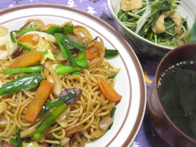 当初は別のメニューの予定だったんですが、ご飯を切らしていたのに気付くのが遅れたので、急遽焼きそばに変更。これに水菜と油揚げの煮びたし、わかめスープで。