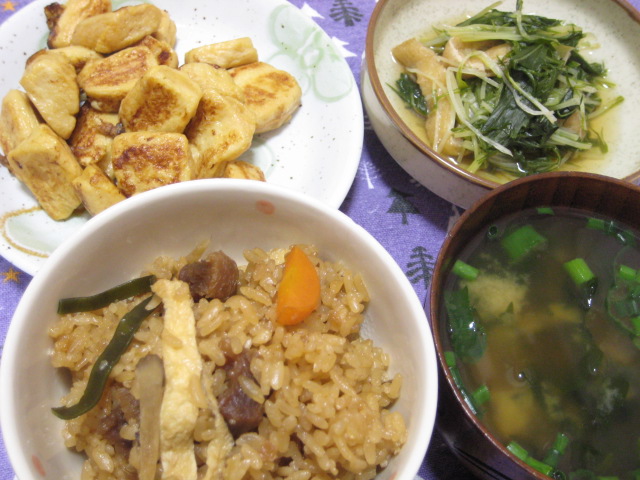 ご飯の味付けはそれほど濃いものにしていないので、合わせるおかずもケンカしない程度のあっさり系で。麩チャンプルー、水菜と油揚げの煮びたし、わかめの味噌汁。