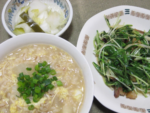 昨夜はご飯が中途半端に残っていたのと、温まるものが食べたかった、それと大根を消費しておきたかったので、合わせて雑炊に。これに水菜のニンニク炒め、水キムチで。