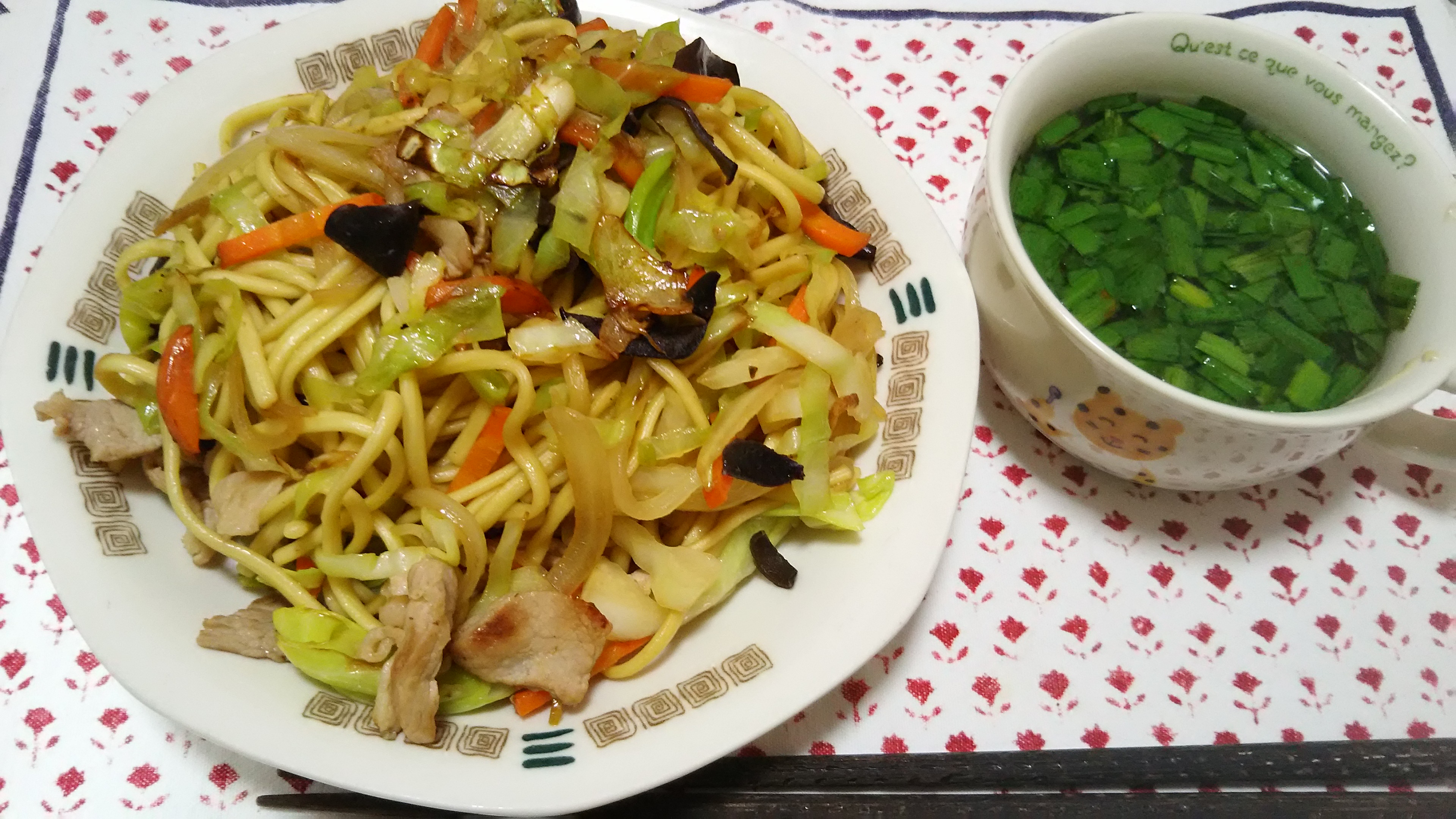 夕飯は焼きそば用の麺を買っていたので、にんにく醤油風味の焼きそばに。具材は中華の焼きそばとほぼ同じ感じですね。