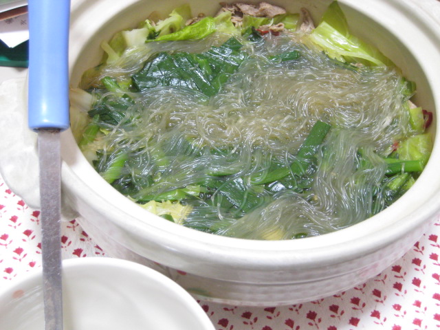 熱した土鍋にごま油を入れ、それで食べやすいサイズに切っておいた豚肉を炒め、火が通ってきたら水600㏄を投入。そのままやや強火で煮てアクを取ったら、粉末鶏ガラスープ小さじ2と醤油とみりんで味を調え、千切りにした唐辛子1本とスライスしたニンニク1~2片を入れ、そこにざく切りにしておいたキャベツ、ニラ、春雨(あらかじめ戻さず、そのままカットなしで)を加えて蓋をし、数分煮立てれば、もうできあがり。これ、材料の準備から完成までに20分ほどで全て終わるので、忙しい時にはかなりありがたいかも。加える野菜の量でスープの味が薄くなるので、醤油とみりんはその辺考えて加えたらいいかと。個人的には、ここに粗びきコショウを加えたら、よりいい感じになりましたが(笑)締めは中華麺を入れるのがおススメですね。結局スープも残さず食べられましたよ。
