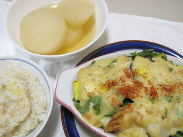 寒かったのと、牛乳を片付けたかったので、この日は和風グラタン。具材はおからニョッキに、ちくわ、長ネギ、大根の葉。グラタンソースには鶏味噌を混ぜたんですが、まだちょっと硬かったような…もう少し緩めの仕上がりでよかったですねw