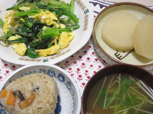 炒め物はじゃこに塩気があるので、味付けはなるべく薄めに。青菜をごま油で炒めて最後に軽くニョクマムをかけました(ナンプラーだと塩気が強すぎるんで)これに、作り置きのふろふき大根に、水菜の味噌汁をプラス。