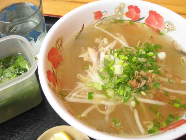 鶏肉のバインカンということですが、スープと具は鶏肉のフォーと同じ内容だと思います(ベトナムでは麺の種類が違うだけで、具とスープは同じってものは結構あります)。あっさりしているので、ここに好みでレモン(現地ではチャインという柑橘類)を絞ったり、香草を入れたり、チリソースを加えたり、自分好みにカスタマイズして食べるのがあちら流。