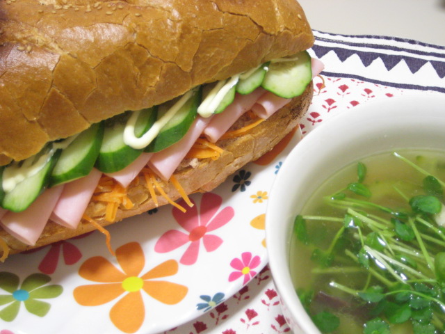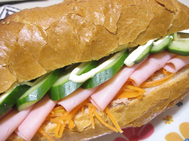 で、この他に日本でもバインミーが作りたいと、向こうで購入したレバーペーストも出しました。これにロースハムとキュウリ、あと本来なら大根とニンジンのなますなんですが、代わりに作ってあったなます風サラダを挟んでみました(ニンジンだけですがw)。塗るのはバターよりもマーガリンが定番らしいです。うちはマーガリンしか置いてないので、勿論それでw