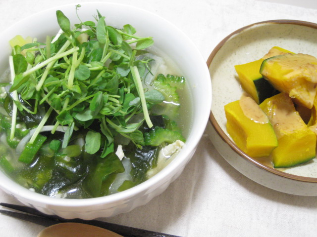 これに合わせたスープはゴーヤと豚そぼろのスープ。これもベースはベトナム料理の本にあったゴーヤの肉詰めスープです。ただ、あれは4人前なのと、作るのにそこそこのサイズのゴーヤが必要なので、流石に作りにくかったんで、それをヒントにだけさせてもらったんですが、美味しかったです。スープにすると、ゴーヤってほとんど苦味がなくなるんですね。今回は大体の目分量で作ったので、いずれちゃんとしたレシピを起こそうと思います。