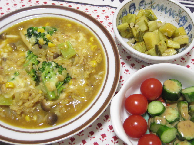 この日は保温していたご飯の残り具合が多めだったのと、夜になると少し涼しかったので、こんなものを作ってみました。カレー味のスープがちょっとあっさり目なので、仕上げにピザ用チーズを散らしたら、いい感じにコクが出て美味しかったですね。