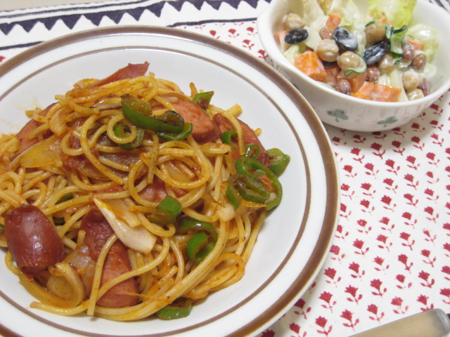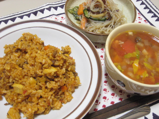 もう月末なので、この時期はストック品を利用したご飯作りになってます。この日は残ってた冷凍ミートソースを全部使って焼き飯に。ご飯と炒め合わせるとちょっと味が薄いので(あと、少し具も増やしたので)、若干ウスターソースを加えました。