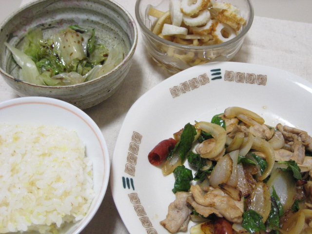 そんなわけでのこの日の夕飯。メインの豚肉炒めは、ほんらい鶏肉で作っているのですが、この日はなかったので豚で代用してみました…が、個人的にはやっぱり鶏肉で作った方が好みかもですwああ、でも、この日のやつはナンプラーが切れていたので、ヌクマムを代用したので、それも若干影響してるかなぁ…ナンプラーに比べると、塩分が少ないので、一応別に塩コショウは加えたんですが(そのものの味としては、タレヤドレッシングなどの応用が利くので、個人的にはヌクマムの方が好みですが)。