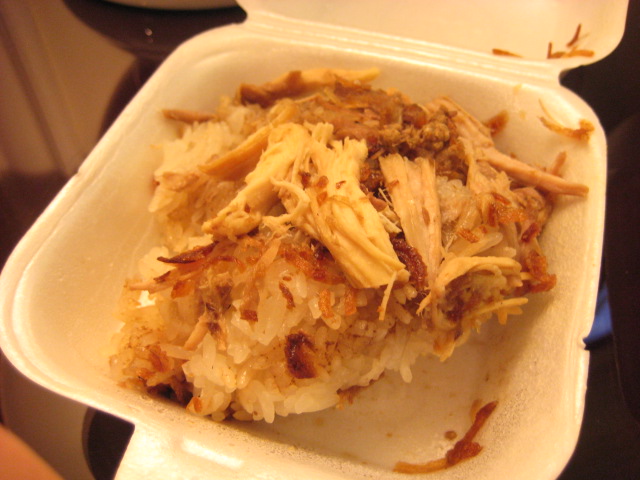ホテルへ持ち帰って部屋で早速いただくことに。こっちは鶏おこわ。味をつけて蒸したもち米にほぐした鶏肉と揚げ玉ねぎがトッピングされてます。あっさりした味で万人受けするでしょうね。