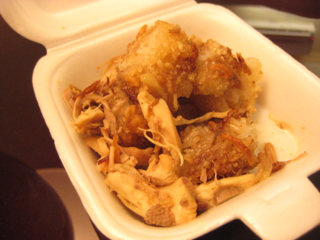 で、私が気に入ったのはこっち。揚げおこわ(SOI CHIENだったかな?)おこわを一旦おにぎりのように丸く固めて、それを油で揚げ、出来立てに醤油をかけて、ハサミで食べやすく切ったのだと思うんですが、焼きおにぎりみたいで実に香ばしくて美味しいんですよ!(ちなみにトッピングは鶏おこわと多分同じ)これはビールとか進みそうww