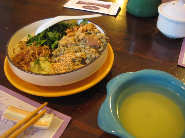 フエの料理で有名なのといえば、溶いた米粉を小皿で蒸して、そこに干しエビなどを振りかけたバイン・ベオとか、サトウキビの茎にエビのすり身を巻いて蒸したチャオ・トムなんかが特に有名なんですが、今回私が一番食べたかったものが、これ!コム・ヘン(シジミの汁かけご飯)です。白飯の上にシジミのむき身、バナナの花の千切り、砕いたピーナツ、刻みねぎ、揚げ玉ねぎがのっていて、これを混ぜ合わせてから、横にあるシジミのスープをかけて食べるのです。シンプルだけど実に美味しそうで、現地在住の方のブログで見て以来、今度行くことがあったら食べてみたいものの一番上に来てたんですよ~~うふふ♪