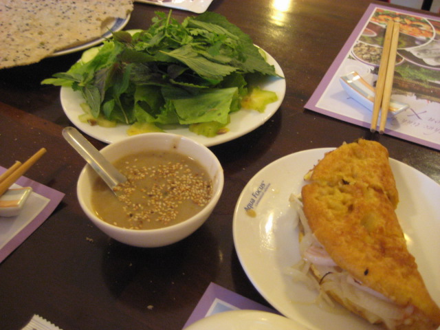 もう一つ注文したのはこれ。南部料理のバイン・セオ(ベトナム風お好み焼き)を二回りほど小型にしたような感じなのですが、料理の名前が思い出せない…w実際、バイン・セオは日本で食べたことがあるんですが、ボリュームがありすぎて、あれだけでお腹いっぱいになりかねない…ってことで、今回は敬遠してたので、小さいサイズなら大丈夫よねwってことで頼みました。バイン・セオよりも心持ち皮は厚めだったかな?ぷりぷりのエビとか入ってて、美味しかったです。
