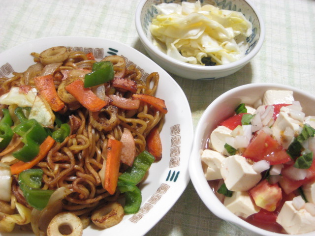 この日の夕飯は冷蔵庫の野菜とハムを使って、カレー味の焼きそばがメイン。これに作り置きの塩キャベツ、トマトと干し豆腐のバジルサラダを。