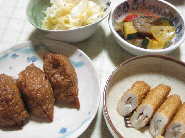 いなりずし用の油揚げが特売で出ていたので、ギリギリの日にも手軽に食べられるよう、多めに作りました。中身にはひじきの佃煮と白ゴマ入り。余った分は小分けにして冷凍。荷作り中に自然解凍しておいて食べられるし、食器も基本要らないので助かるかなw
