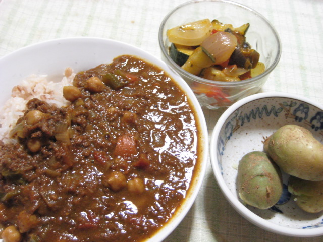 この日は冷凍ストック品のカレーに、作り置きのラタトゥユ、ボイルした新じゃがを。