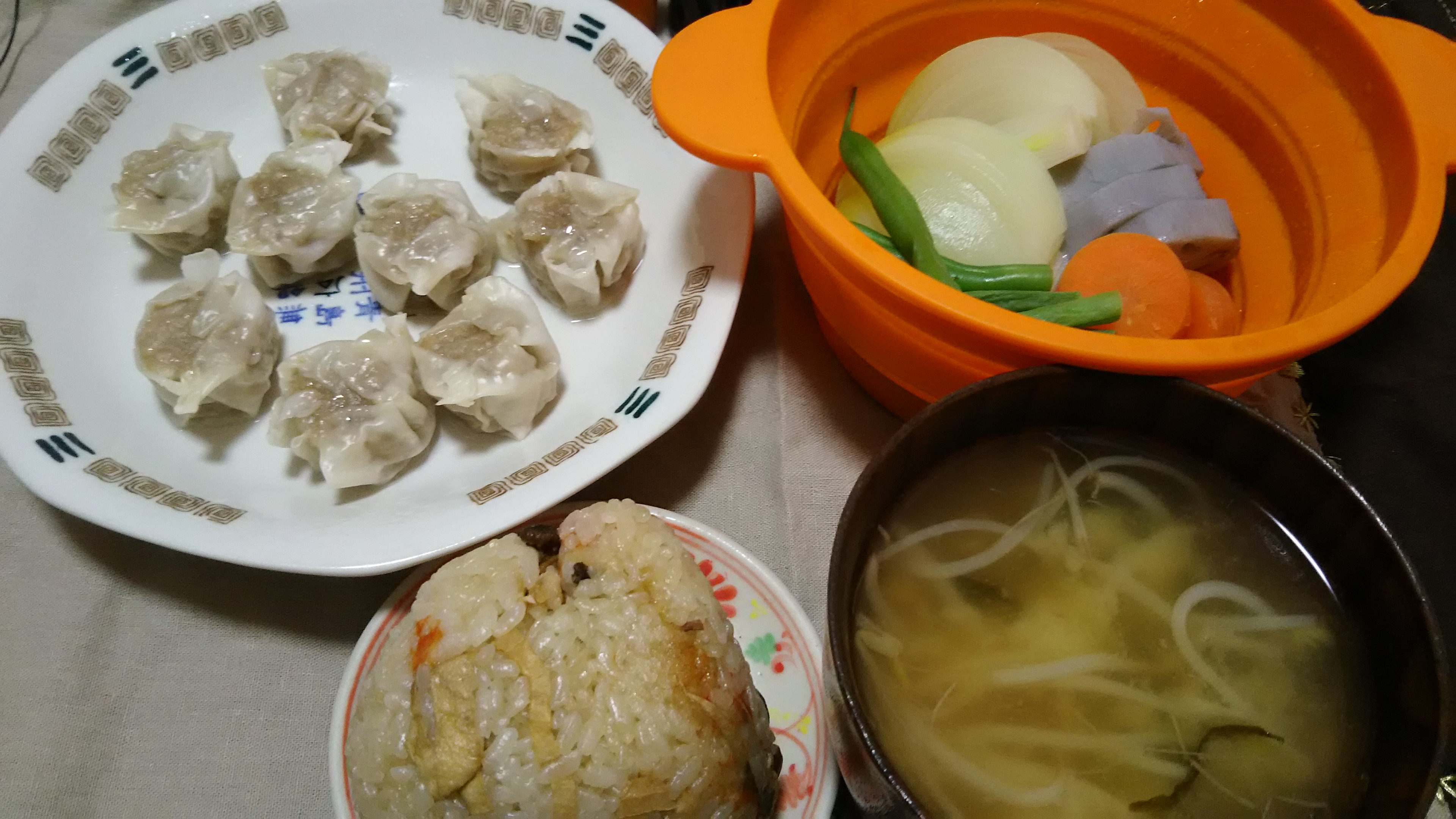 この日は作ってると遅くなりそうだったので、あるものの寄せ集め。メインのシュウマイはチルド品。これに蒸し野菜、もやしの味噌汁、かやくご飯のおにぎりで。