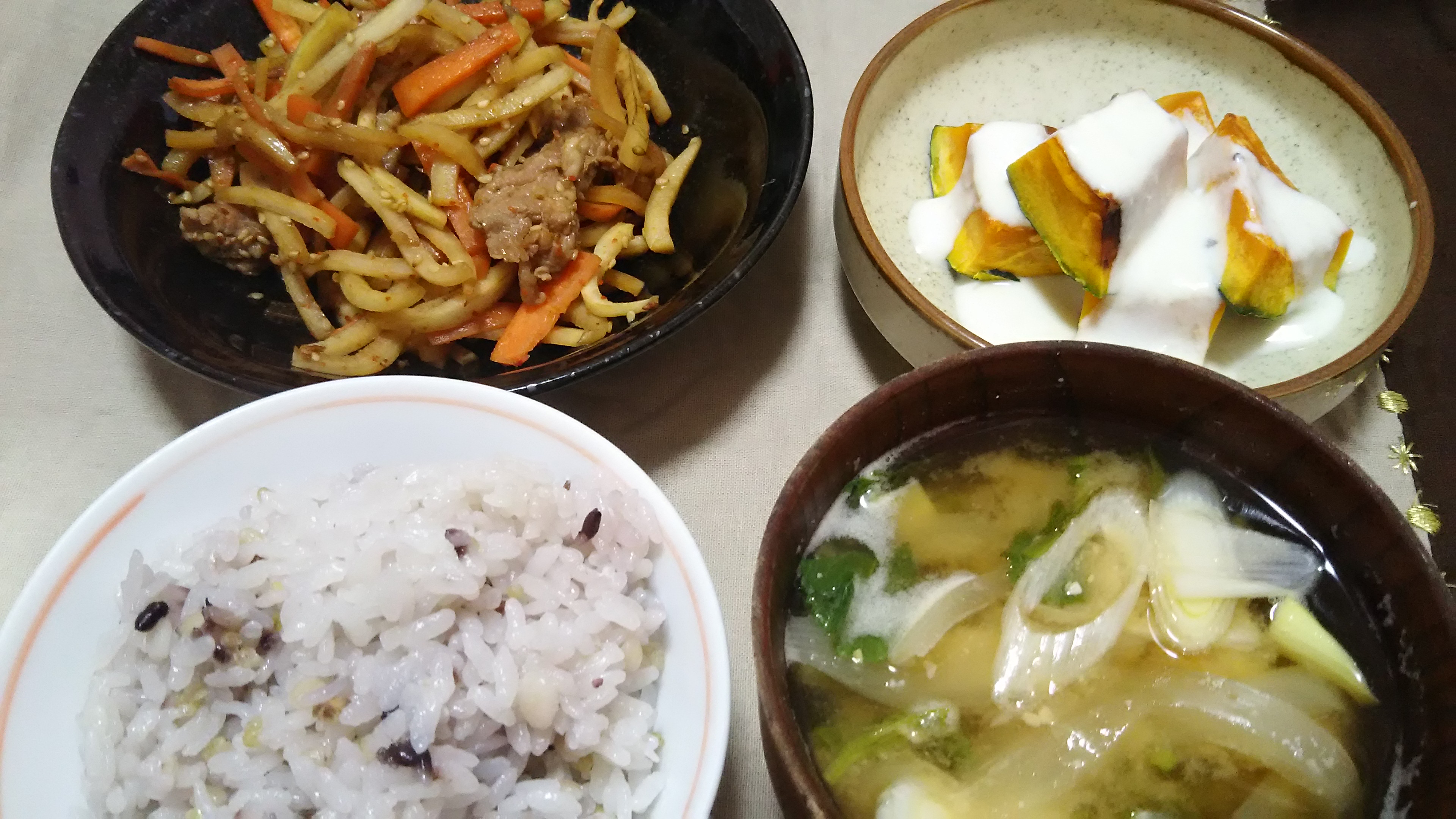 肉キンピラ、蒸しカボチャのヨーグルトソースがけ、玉ねぎの味噌汁、雑穀入りご飯。