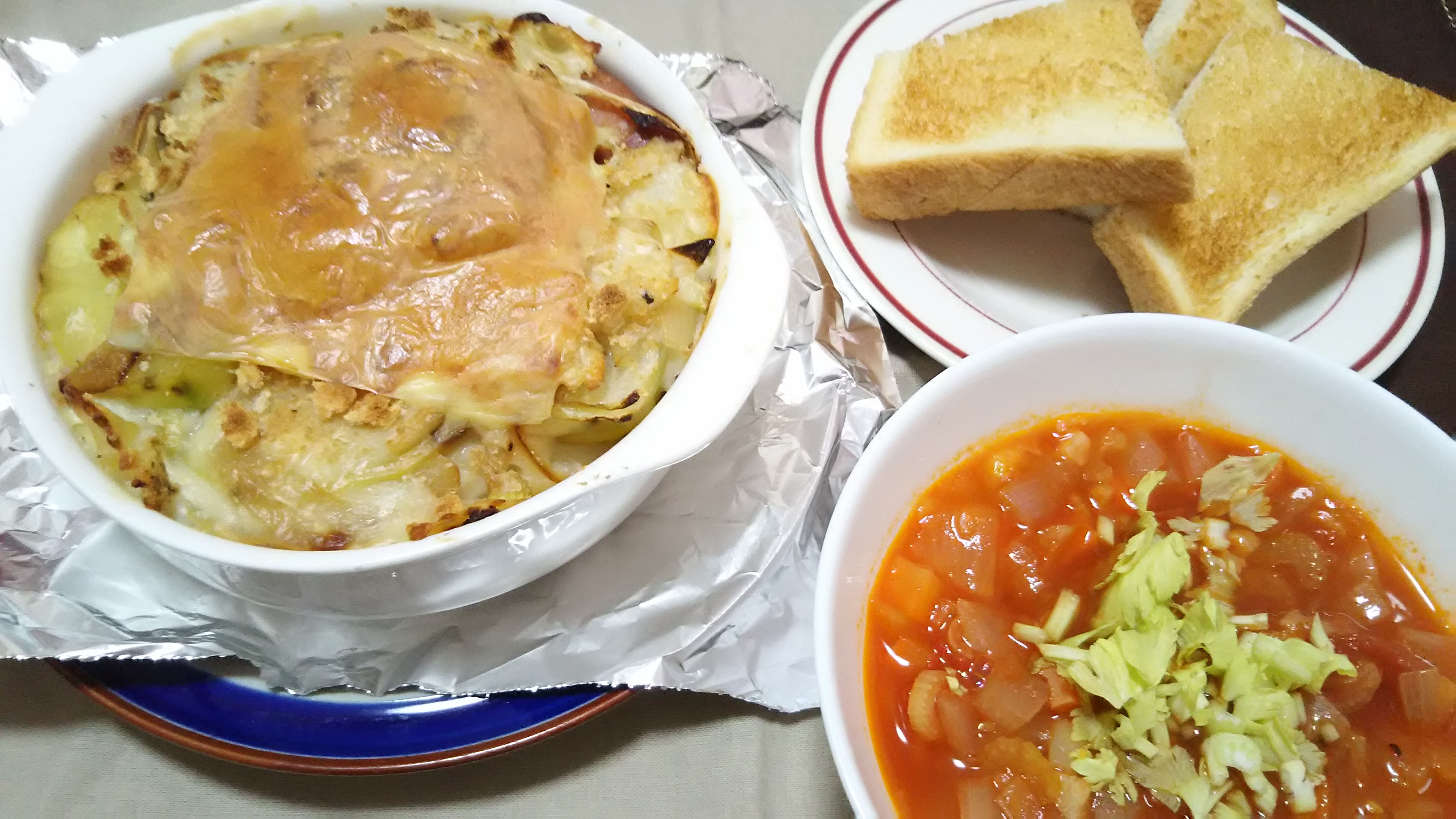 この日はマカロニグラタン、トマトベースの野菜スープ、トースト。