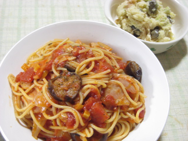 昨日の夕飯(4/10):ナスとトマトのパスタ他