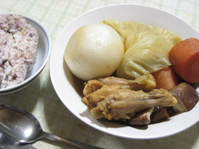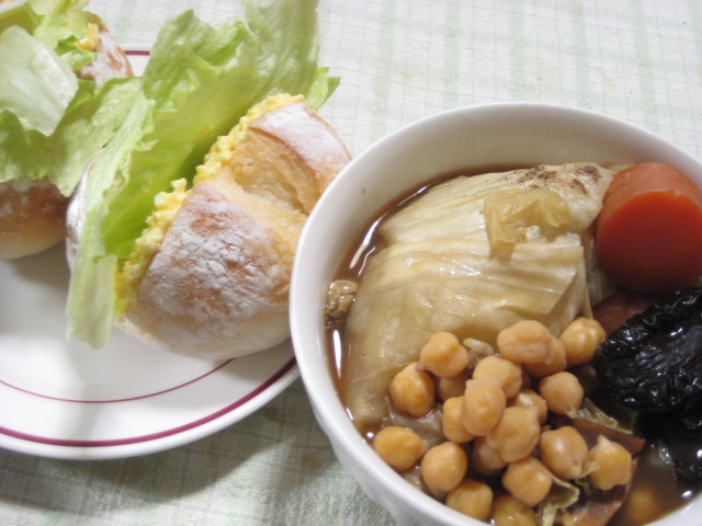 それだけだとボリューム不足なので、前日のポトフに使ったスープストックで、具を変えて改めてポトフを(この日はキャベツ、ニンジン、ドライトマト、ガルバンゾー)。
