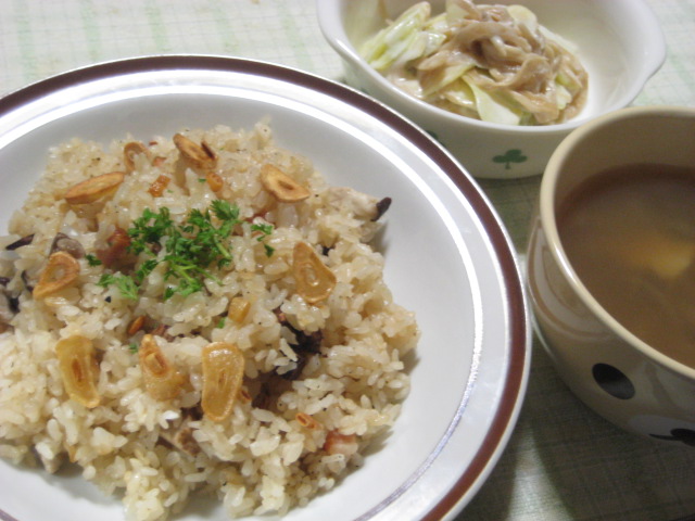 昨日の夕飯(4/14):ベーコンと新玉ねぎのピラフ他