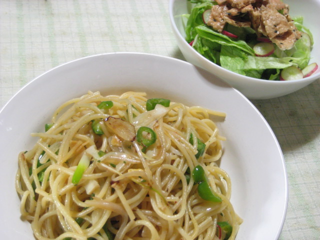 この日は帰宅がちょっと遅めになったので、早くできるよう、市販のパスタソースを使ってのパンチェッタ。具なしでも食べられるタイプなんですが、野菜が欲しかったので、ピーマンと玉ねぎだけ炒めて、麺と合わせてます。これに、レタスとハツカダイコンのサラダをゴマせんべいのトッピングとヌクチャムをドレッシング代わりに。