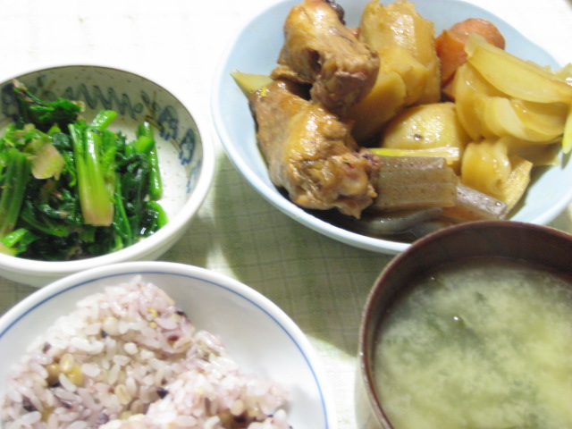 これにほうれん草のおひたしと、わかめの味噌汁、雑穀入りご飯で。
