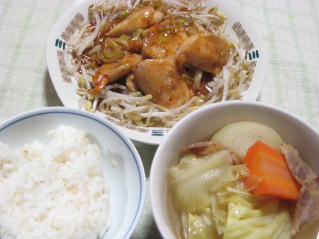 昨日の夕飯(3/22):鶏胸肉のチリソース炒め他