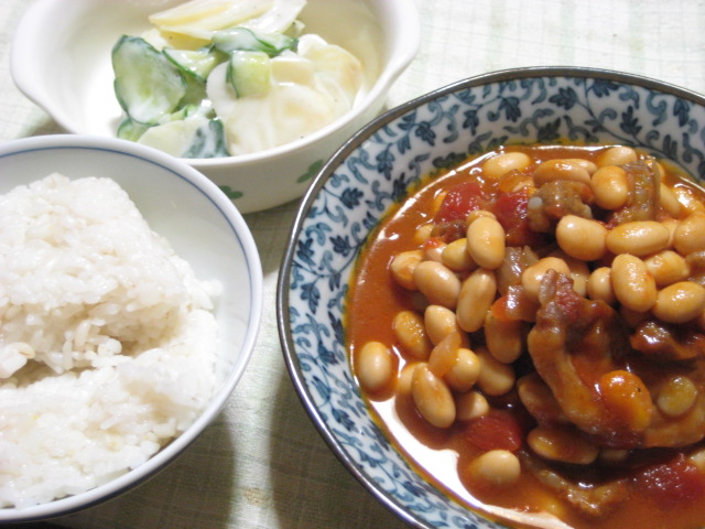 冷凍していた豚の軟骨つき肉を下ろしたので、この日はポークビーンズに。じっくり煮込んだ方がいいので、仕込みは前日からやってました。サラダはジャガイモときゅうりのパリパリサラダで。ポークビーンズは、ご飯にかけて食べるのも好きなので、面倒な時はご飯と一緒の器にするんですが、この日はとりあえず別にしてみましたよw