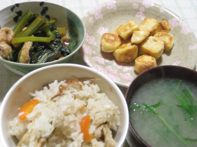 この日は冷凍庫のストックと、乾物でかやくご飯を。おかずは麩チャンプルーと小松菜と油揚げの煮物、味噌汁は水菜で。
