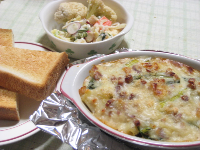 昨日の夕飯(3/15):ほうれん草とパンチェッタのマカロニグラタン他