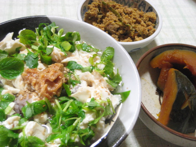 そんなわけで、この日も一番早い時間よりも少し遅めの帰宅。疲れが溜まってたので、早く作れるものをと思い、残った鶏味噌と豆腐でお茶漬けを。そこにカレーおから、カボチャの煮つけをプラスして。