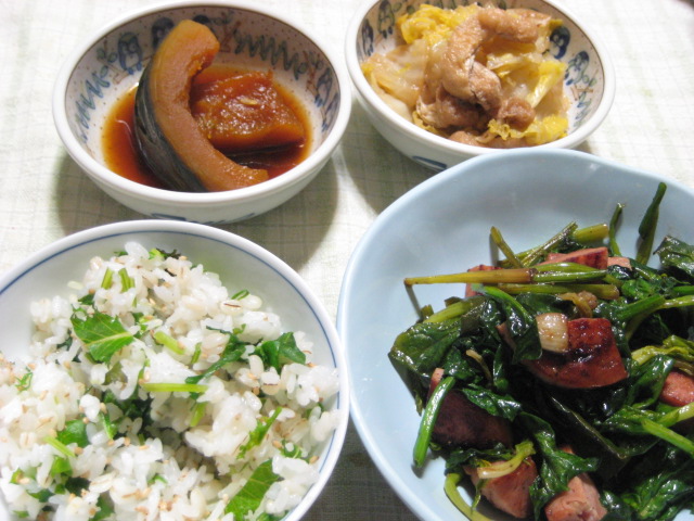 ご飯は間引きした水菜、小松菜、カラシ菜を刻んで塩もみしたものを混ぜ込んだ、菜飯に。菜飯は多めに作って、おにぎりにしたものを翌日の弁当にしましたよ