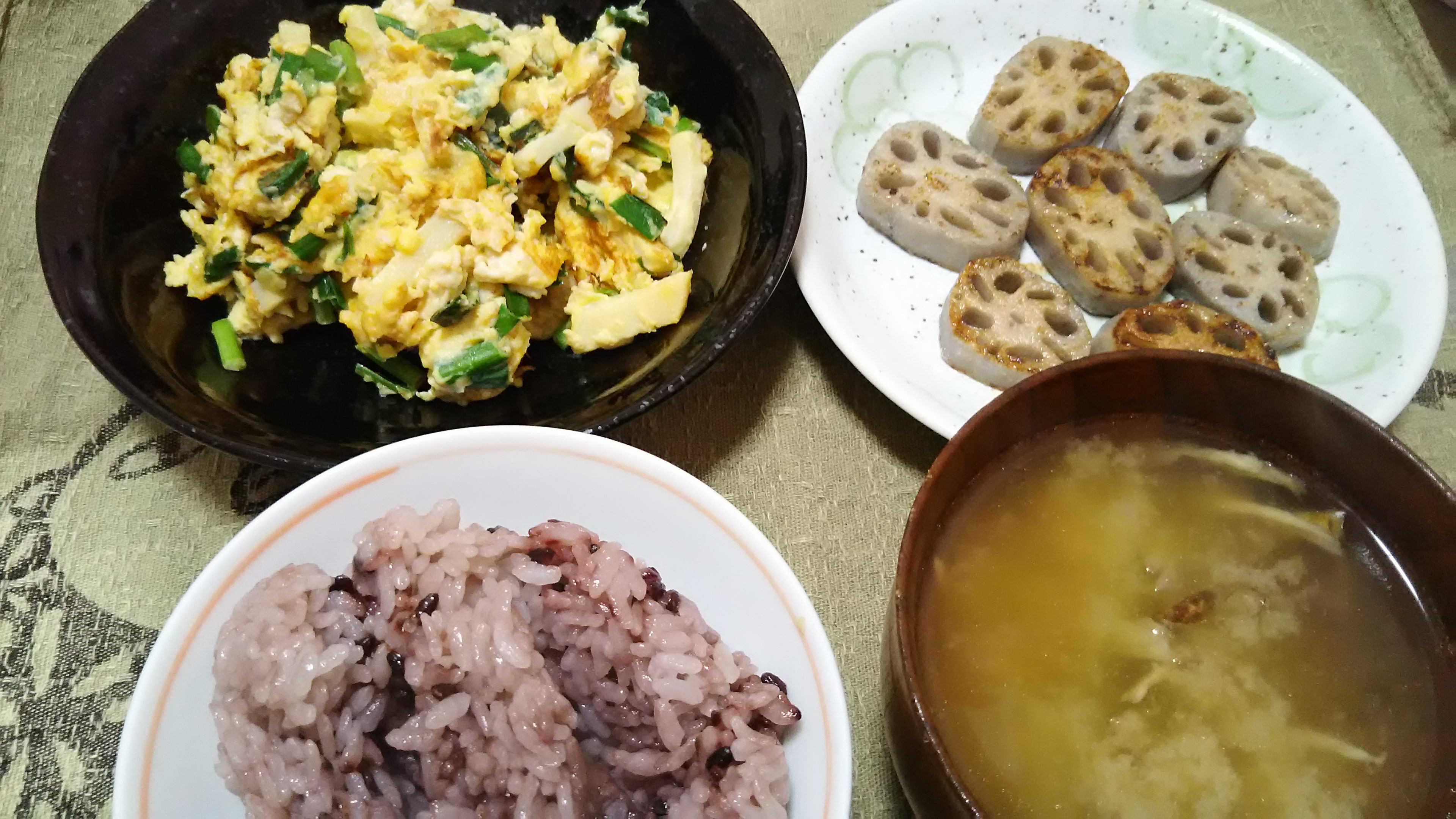 副菜はレンコンのジリジリ焼き、味噌汁は干しゴボウで。