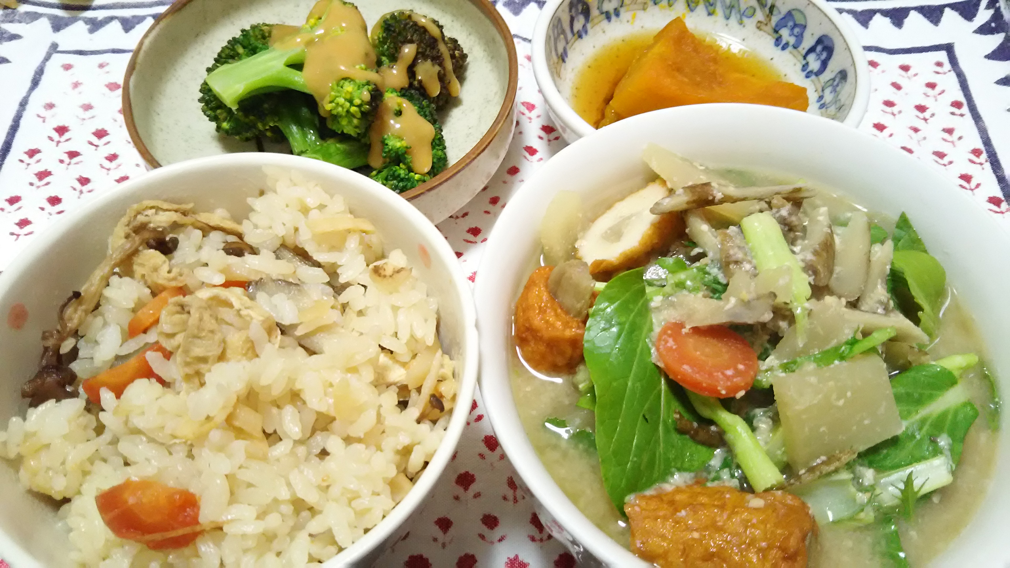 この日も冷凍庫のストック品の整理。アラ汁はアラにあまり身がついてない分、ゴボウ天や野菜などでボリュームアップ。ご飯は干しキノコや切り干し大根で炊き込みご飯に。