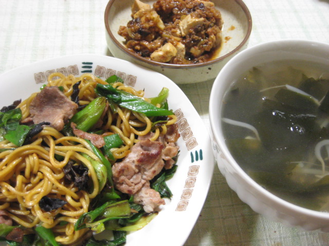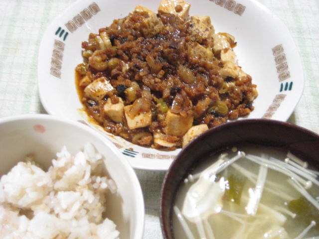 副菜は前日の麻婆豆腐の残りを。汁はわかめともやしの酢入り中華スープで。