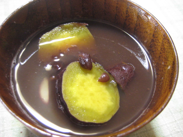 ゆであずきの缶を買ってあったので、ぜんざいにしてみました…が、お餅がなかったので代わりにサツマイモを入れてみました。