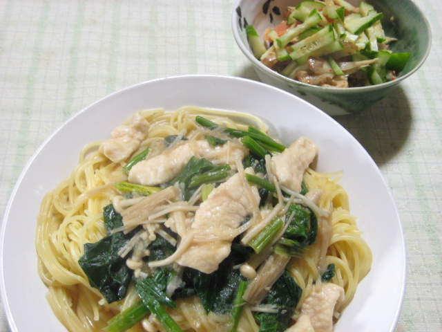この日はご飯がなかったので、パスタに。冷凍の菜の花と鶏胸肉を炒め、めんつゆベースのあんを絡めてかけてみました。あんが絡みやすいよう、パスタはいつもより細めのをチョイス