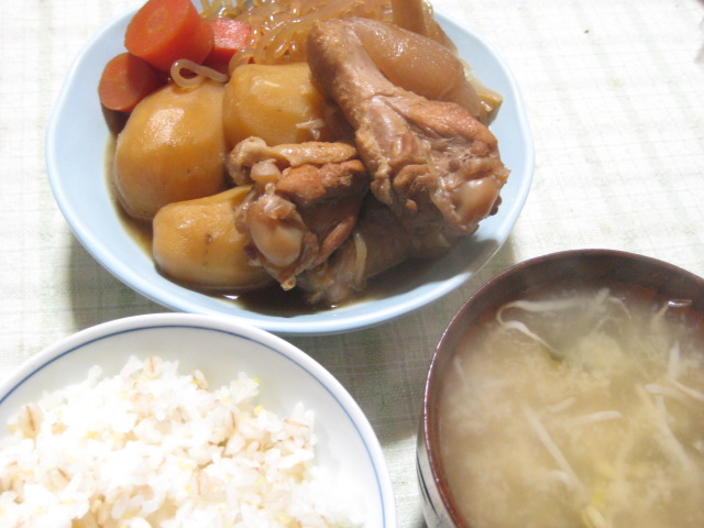 この日の夕飯は久しぶりに肉じゃがにしてみました…が、うちで肉じゃがというと、結構な確率で手羽元を使ってます。理由はぶっちゃけ、牛肉が高いから以外の何者でもないですwちなみに豚肉は、関西ではあまり肉じゃがの具としてはなじみがないってのもあるんですが、一度試しに使ってみて、大不評だったので(脂っぽすぎて)、以来使わないことに(苦笑)なので、うちの肉じゃがは王道は牛肉、変則版で鶏肉ですわw