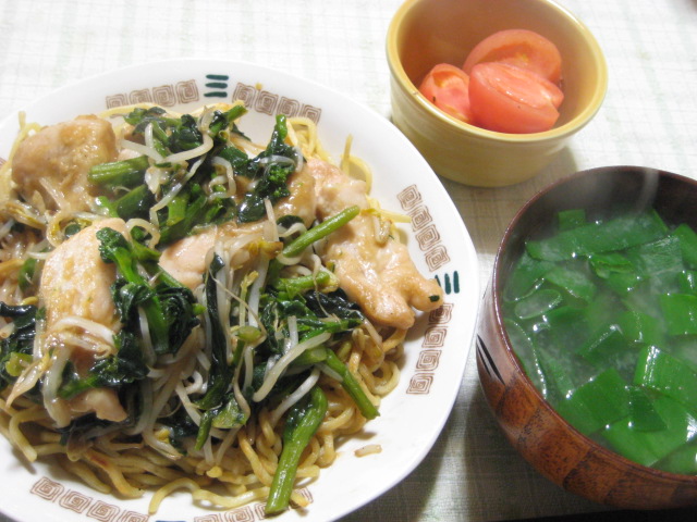 当初焼きそばをするつもりで、麺を買ってあったのですが、たまにはいつもと違ったのをやってみようと、麺は麺だけで焼き(軽くほぐした状態のをある程度の固まり状態で、両面焦げ目をつけるやり方)、そこにちょっととろみをつけた具を載せる炒麺スタイルにしてみました。味付けはオイスターソースベースで。野菜は水菜ともやし。
