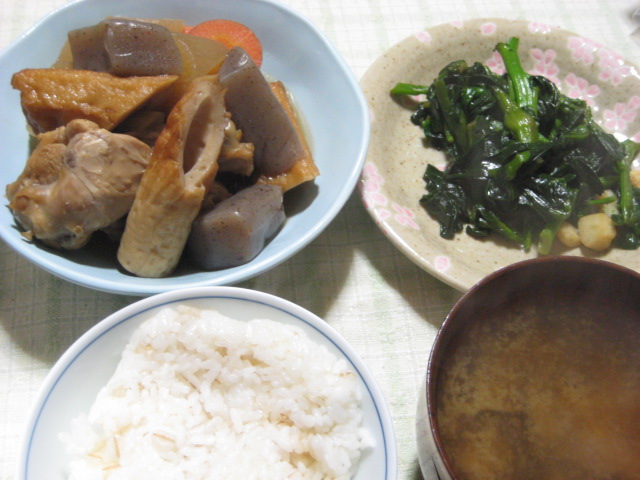 そんなことで、メインは手羽元と大根を中心とした炊き合わせ。それだけだと、ちょっと野菜が少ないと思ったので、菜の花のニンニク炒めを…最近、菜っ葉系は本当に高いので、窮余の策として、冷凍品を使ってみました…思ったよりいい感じです。業務スーパーには野菜の冷凍品があれこれあるので、上手く利用できるといいですね。