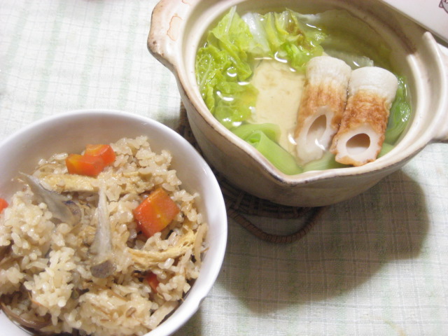 この日の主役はかやくご飯ですね。具は乾物(切り干し大根、干しキノコ)メインに、油揚げやにんじん、ゴボウなどを加えたシンプルなものです(本当は蒸し大豆を加えるつもりが忘れてたw)。
