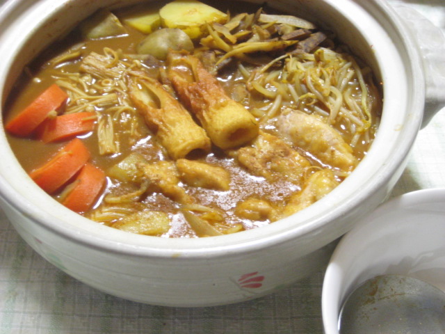 年も押し迫ってきて、なおかつ月末モードなので、買い物も四苦八苦していますwこの日も鍋なんですが、カレー鍋だと、本来キャベツかレタスが欲しいところなのです…が、今はどちらもシャレにならないほど高いので、月末モードの財布で買えるわけなど、当然ナシ…というわけで、彩が若干悪いんですが、手に入る食材&ストックで鍋を作りました。この日の具はジャガイモ、にんじん、玉ねぎ、ゴボウ、もやし、ちくわ、しらたき、鶏胸肉で。